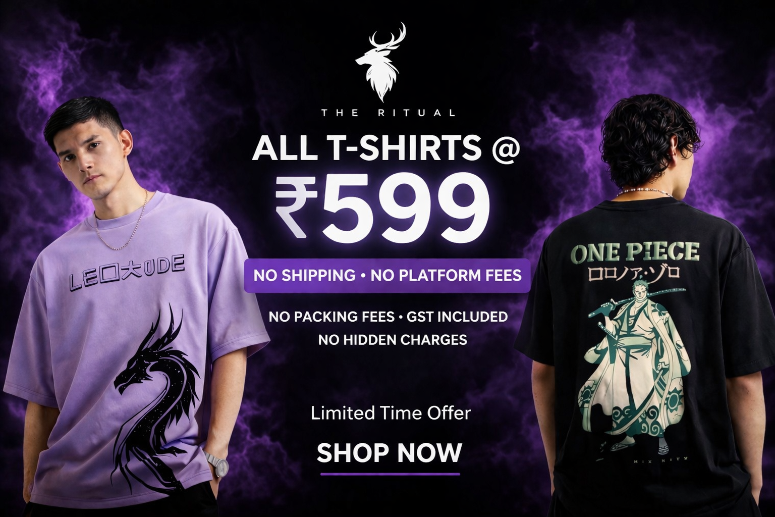 "Welcome to THE RITUAL – a modern streetwear brand that redefines casual fashion. Our collection features oversized printed T-shirts and hoodies designed for comfort and style. This banner captures our edgy yet minimalistic aesthetic with stylish models in urban settings, highlighting the intricate details of our clothing and our iconic brand logo. Perfect for trendsetters who love fashion with attitude."